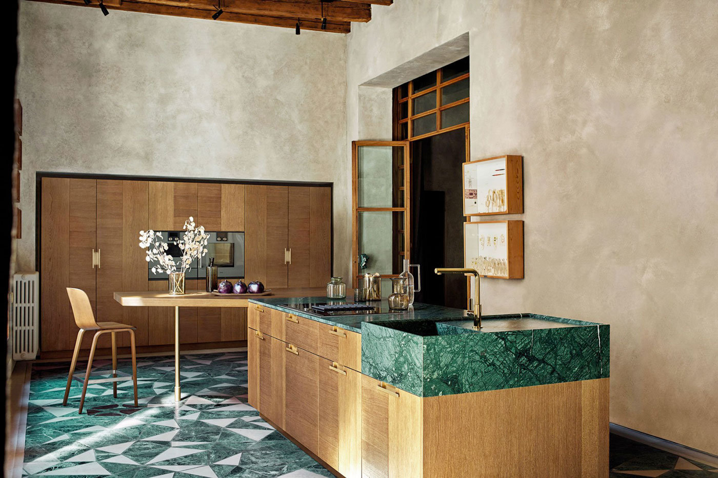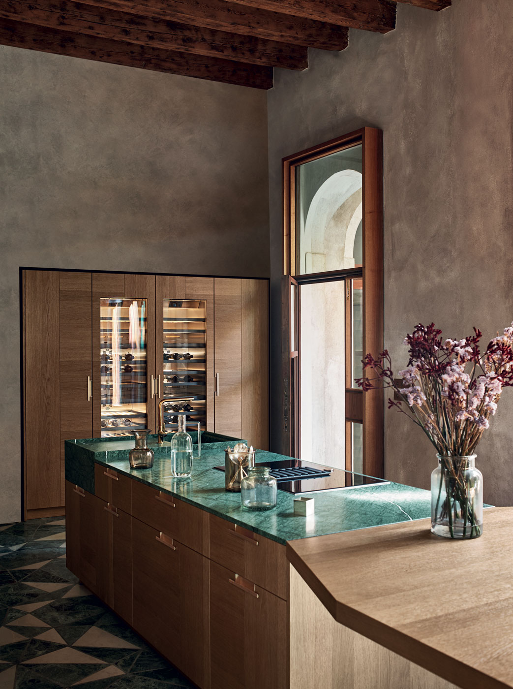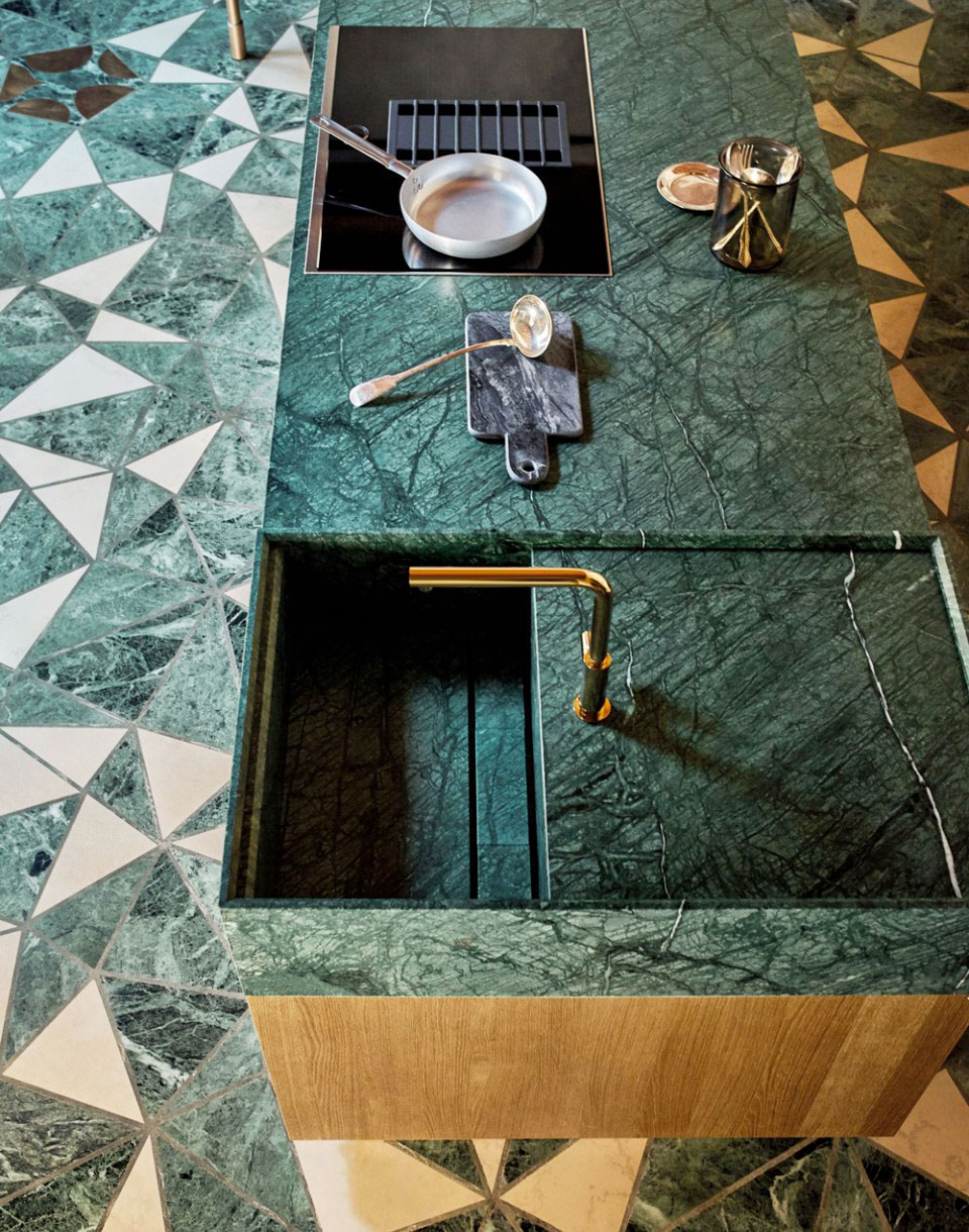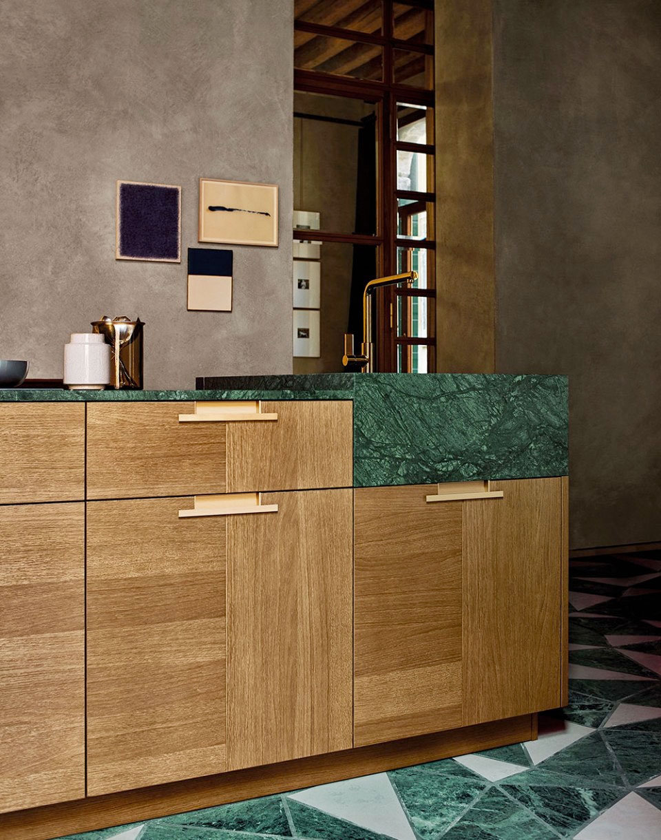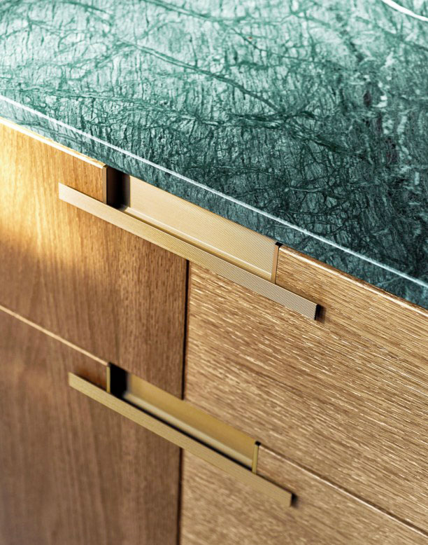 Evokující kompozice dřeva Rovere Mediterraneo a mramoru Guatemala. Design by Garcia Cumini.